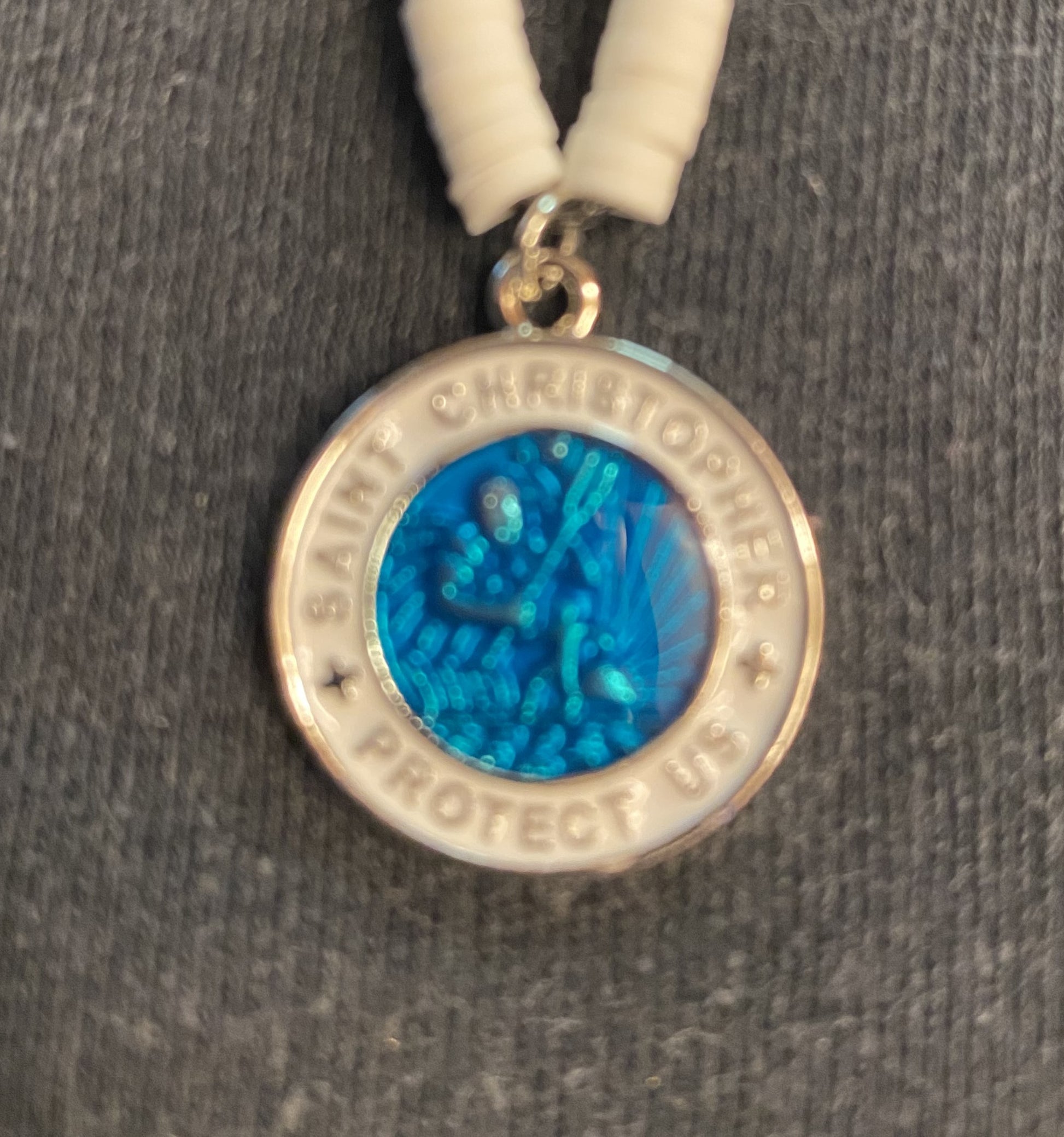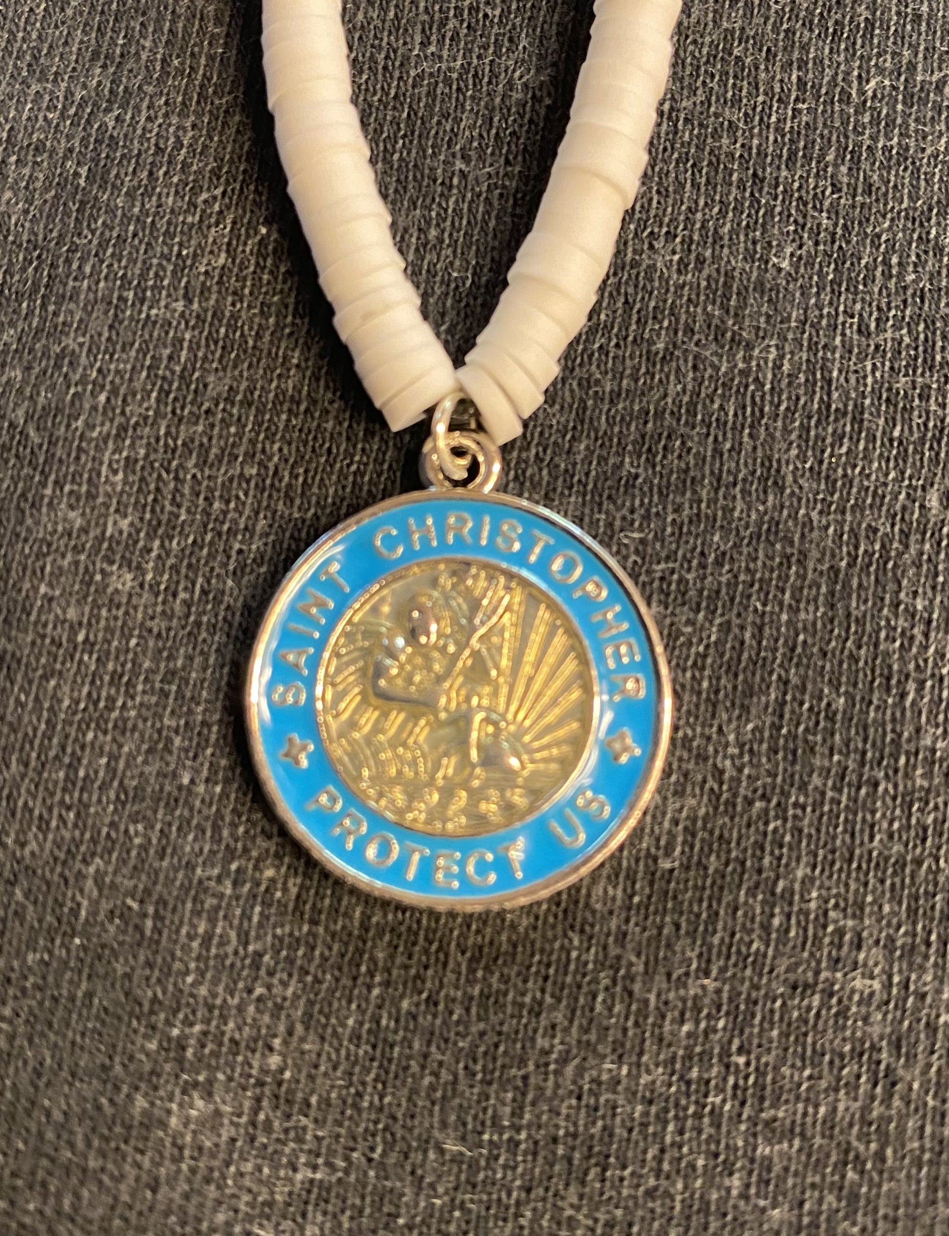 This is a fantastic Surfer Girl Style fashion statement. Necklace is 16" 4mm Puka Shell with a 20mm (3/4") Epoxy Saint Christopher Medal. This is a timeless style worn by Surfers for years making its start of popularity in the 1960's even so today.